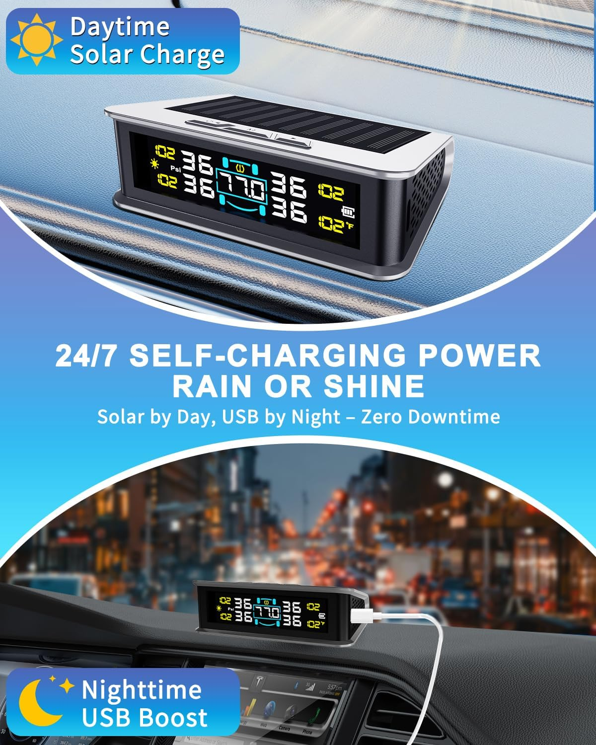 • 【Solar/USB Dual Charging & Smart Power Management】 This advanced TPMS features dual charging: Solar-powered for eco-friendly operation + USB-C fast charging when sunlight is low. The system intelligently powers off 3 minutes after engine shutdown and auto-reactivates on ignition—saving energy without compromising safety. Our TPMS sensors (set of 4) use long-lasting CR1632 batteries (included) with:✓ 6+ months per battery (with smart sleep mode).✓ 2-year total lifespan.✓ Easy battery replacement. Perfect for RVs, trucks, and trailers—always ready when you are!