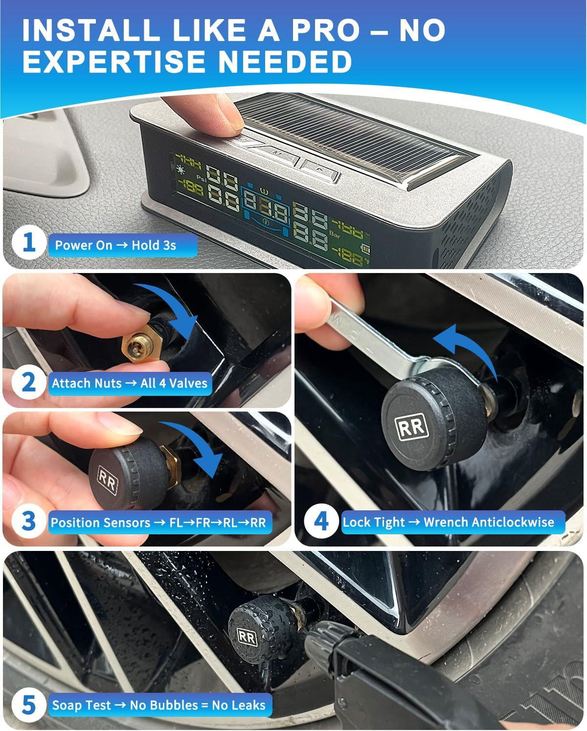 • 【2-Minute Hassle-Free Installation】 5-Step External Tire Sensors Setup – No tire removal! 1.Power on display (hold for 3 seconds). 2.Screw hex nuts onto all 4 valve stems. 3.Install sensors in correct positions:LF → RF → LR → RR. 4. Firmly tighten nuts (anticlockwise) to prevent vibration loosening. 5.Soap water test ensures leak-free seal.Critical Note: Hex nuts are mandatory – They provide:✓ Anti-vibration (prevents sensor loosening at high speeds).✓ Secondary seal (reinforces air-tight connection).✓ Valve protection (shields stems from damage).