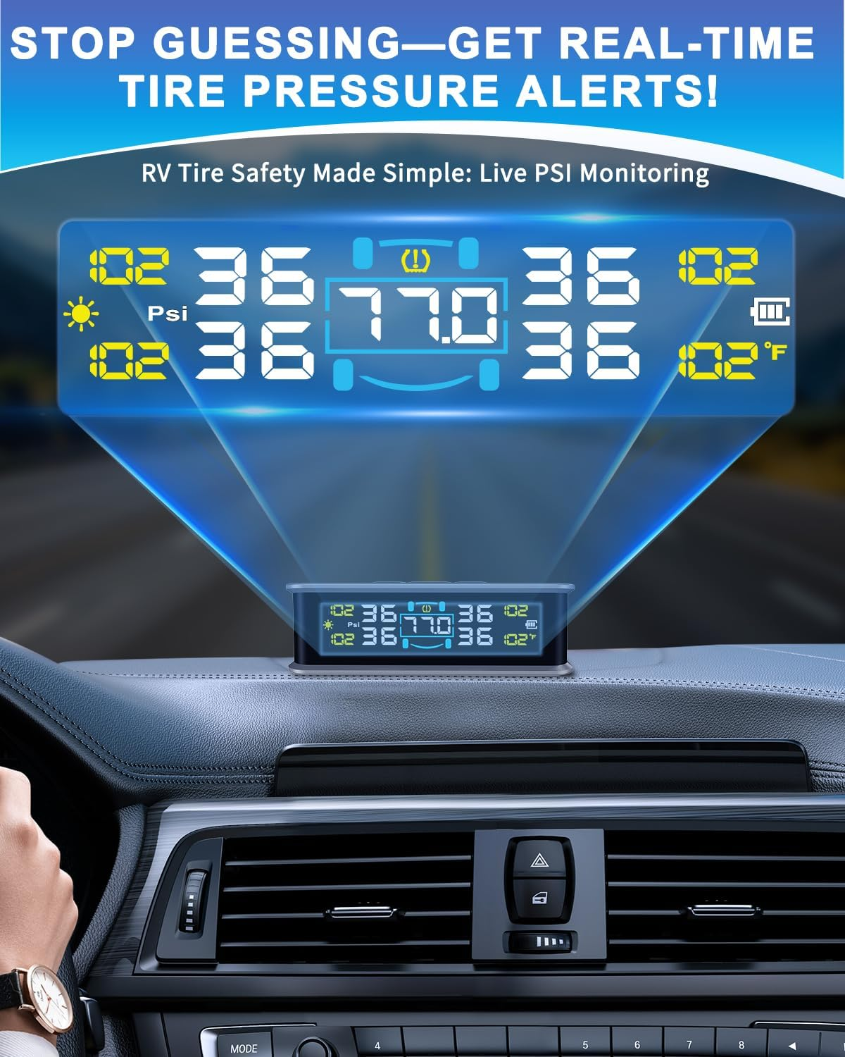 • 【Professional Tire Pressure Monitoring System – 24/7 Real-Time Tracking】 Keep your tires safe with our advanced tire pressure monitoring system (TPMS) featuring ±2 PSI / ±3°F accuracy. Military-grade sensors update every 0.3 seconds (3x faster than standard systems) to track pressure and temperature simultaneously. The LCD display refreshes every 6 seconds, giving you instant alerts for leaks or overheating—perfect for RVs, trucks, and highway towing. Supports PSI/BAR unit switching for universal compatibility with all vehicles.
