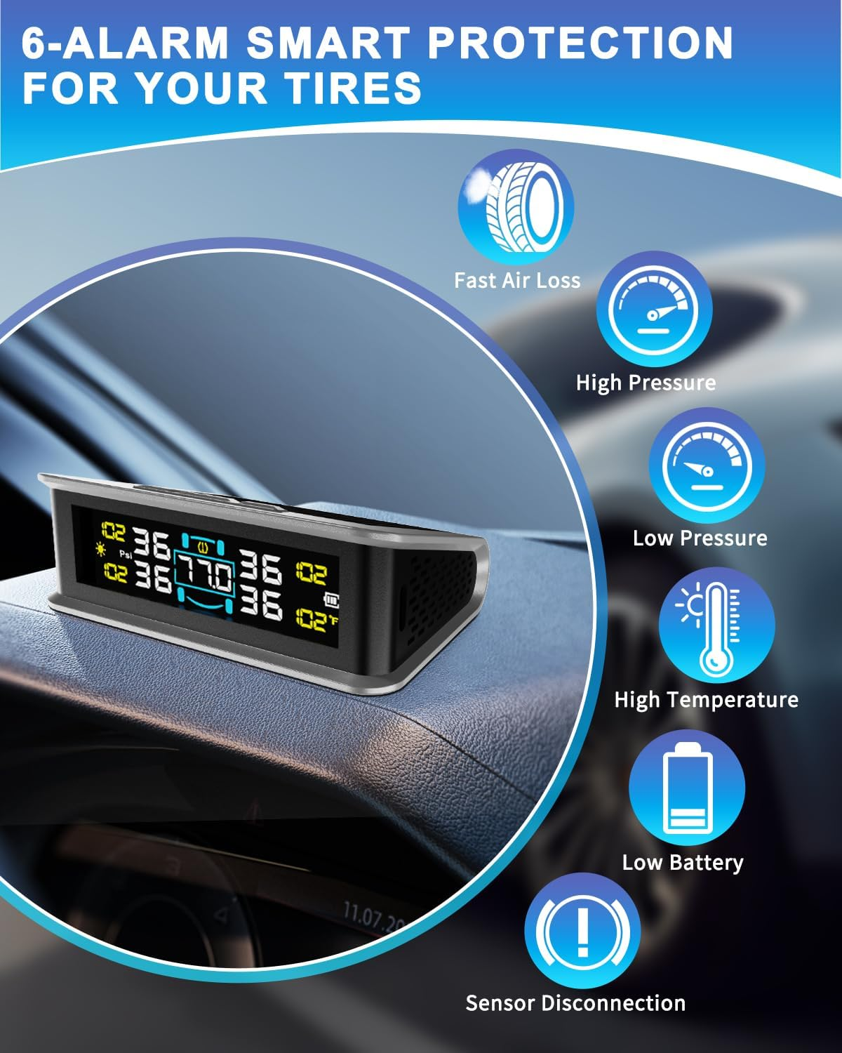 RV Tire Pressure Monitoring System (TPMS) – TPMS Sensors Set of 4 & 6 Alarm Modes | Solar/Usb Charger | LCD Display | for Rv/Truck/Suv/Mpv/Sedan | TPMS Kit