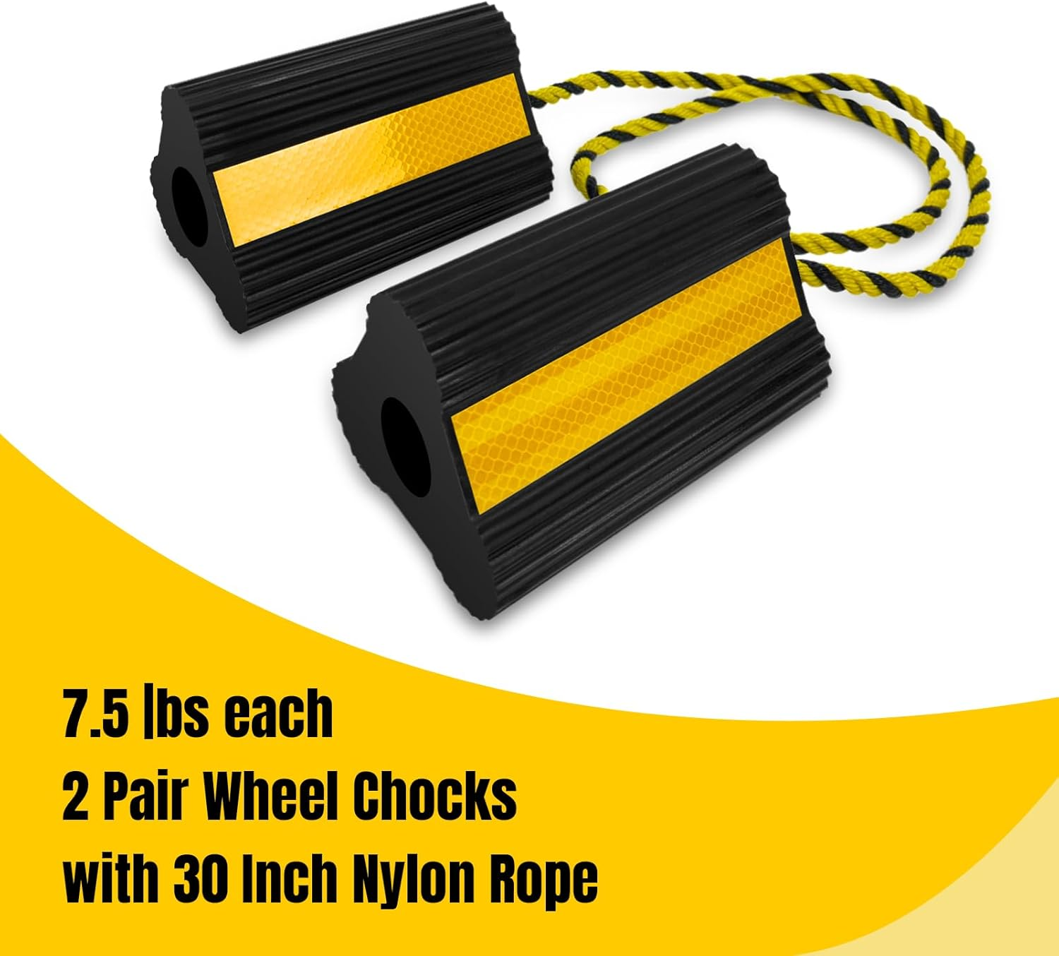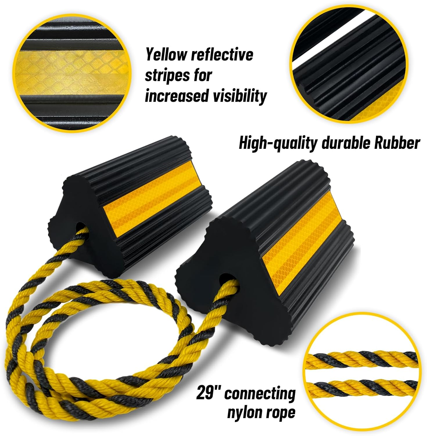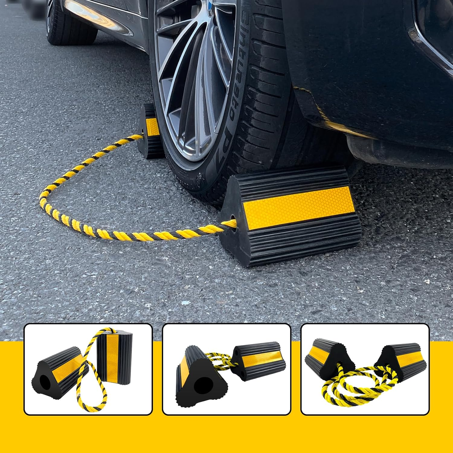 - Enhanced Visibility: Each wheel chock features three yellow reflective strips for increased visibility, even in low-light conditions. Keep your vehicle safe and visible at all times, whether you’re parked in a dimly lit garage or outdoor setting