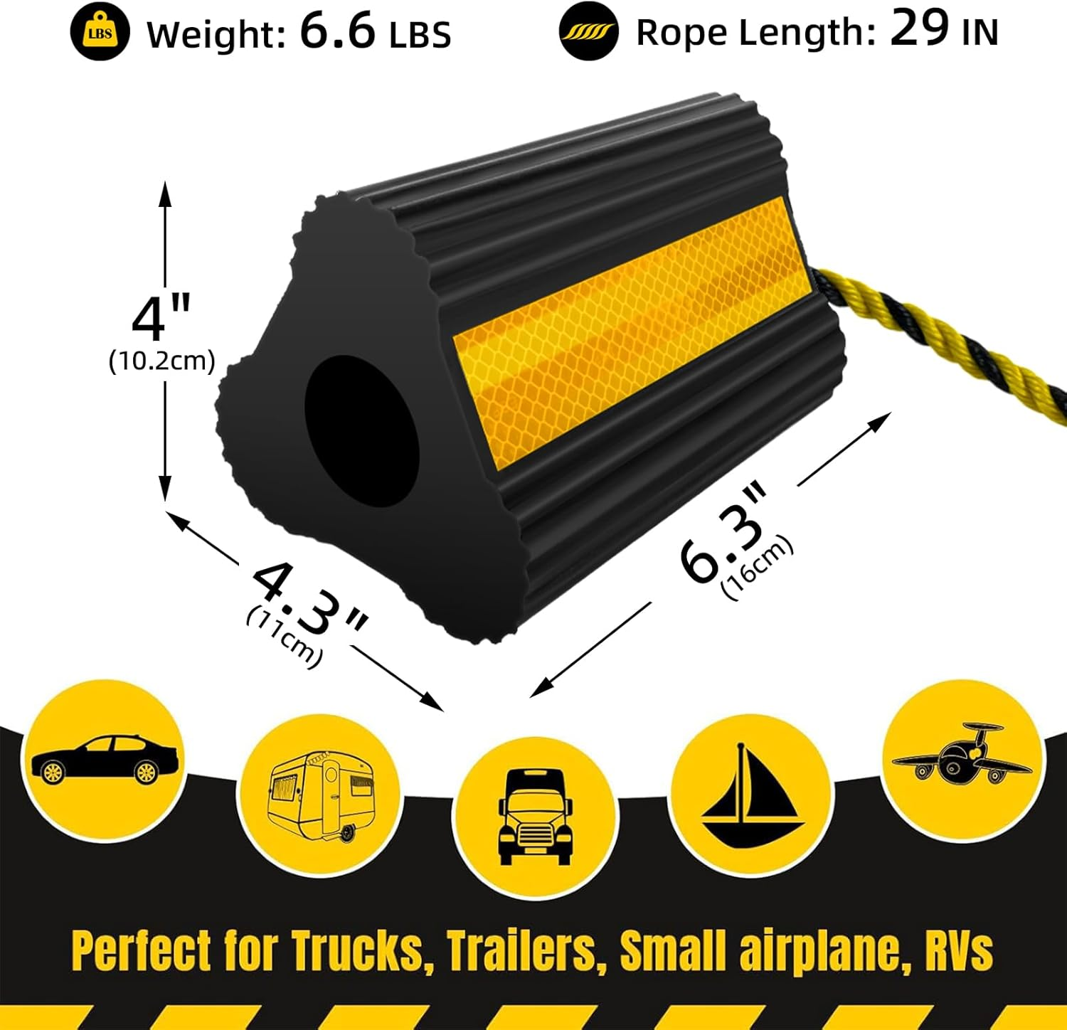 - Premium Quality: Our wheel chocks are made from durable rubber blocks.Size is 6.21″ ×4.71″ ×4.31″ providing reliable tire traction for trucks, trailers, RVs, and small airplanes. Say goodbye to vehicle rolling and ensure safety with our high-performance wheel chocks